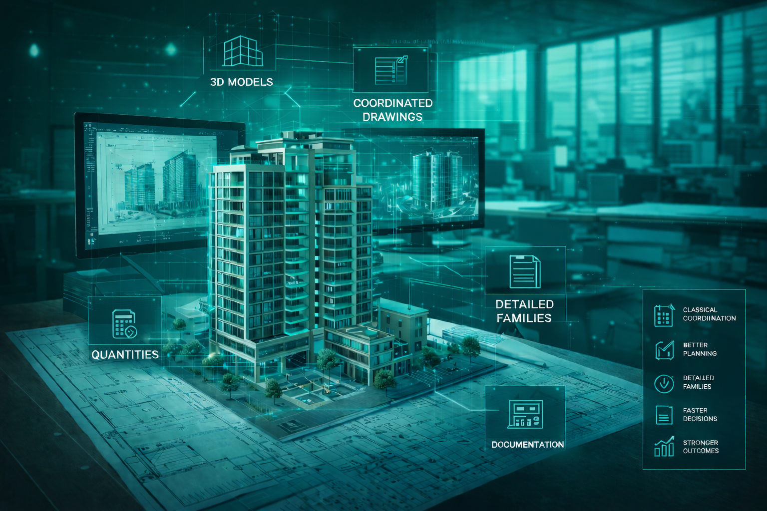 Architecture-led BIM production with disciplined families, templates, and sheets so the model stays authoritative from concept to construction issue.